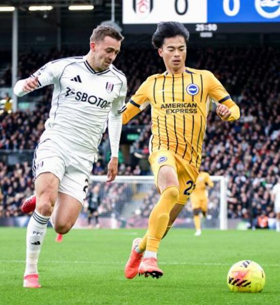 フラム戦で攻め込むブライトンの三笘(右)=ロンドン(共同)