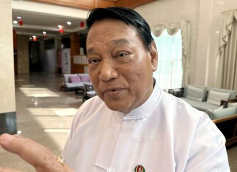 22日、ミャンマー・ヤンゴンで取材に応じる連邦団結発展党のキンイー党首(共同)