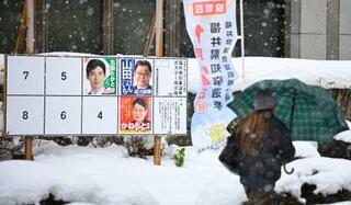 福井県知事選候補者のポスター掲示板。周囲には雪が積もっていた=25日午後、福井市