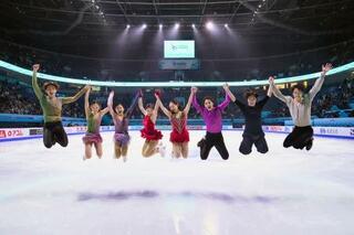 エキシビションを終え、撮影に応じる(左から)森口澄士、長岡柚奈、千葉百音、中井亜美、青木祐奈、友野一希、三浦佳生、山本草太=北京(共同)