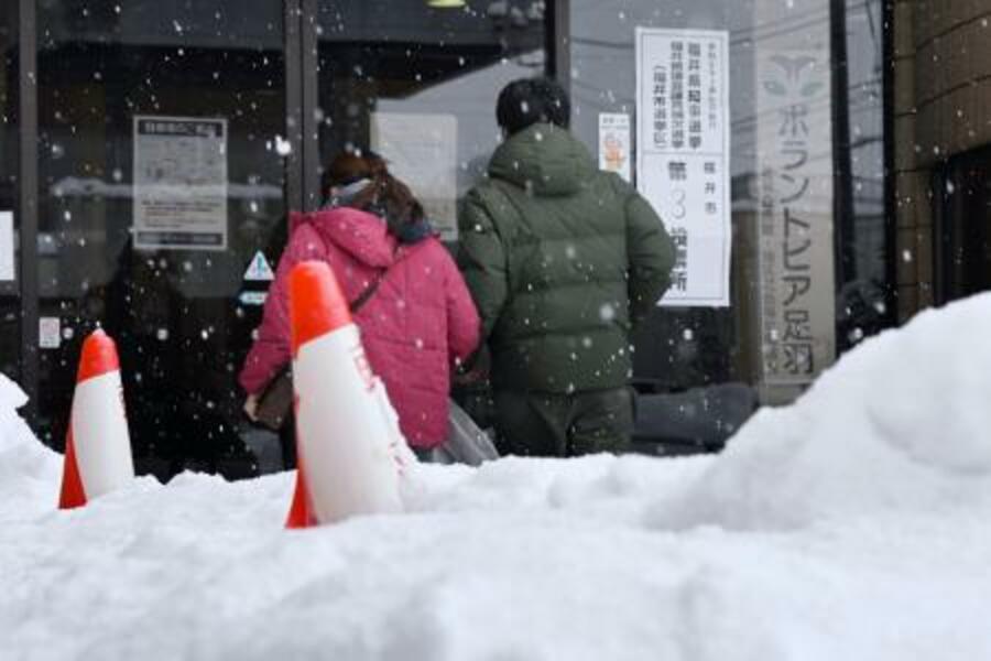 雪が積もる中、福井県知事選の投票所に向かう人たち=25日午後、福井市