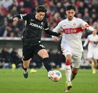 シュツットガルト戦で競り合うフライブルクの鈴木唯(左)=シュツットガルト(共同)