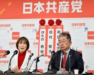 記者会見する共産党の田村委員長(左)と小池書記局長=8日午後11時23分、東京都渋谷区の党本部
