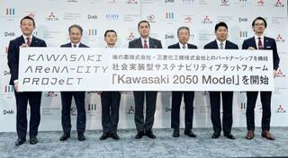 記者会見で写真に納まる川崎市の福田紀彦市長(右から2人目)とB1川崎の元沢伸夫会長(左端)ら=29日、川崎市