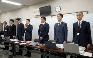 昨年8月に大阪・道頓堀であったビル火災の調査結果について、記者会見する大阪市消防局幹部ら=30日午前、大阪市役所