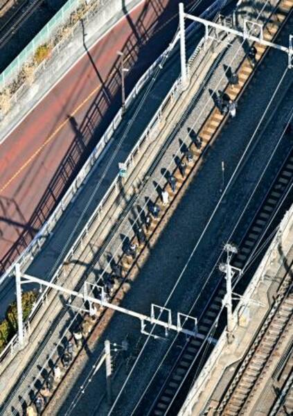 JR上野駅で停電が発生した影響で、常磐線の線路上を歩く人たち=30日午前10時11分、東京都足立区(共同通信社ヘリから)