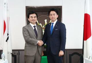 会談を前に握手する小泉防衛相(右)と韓国の安圭伯国防相=30日午後、神奈川県の海上自衛隊横須賀基地(代表撮影)
