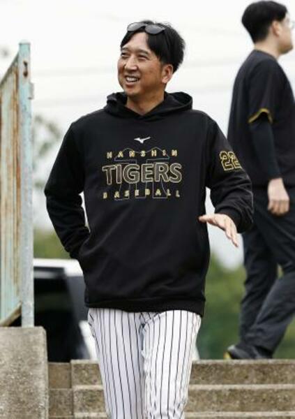 プロ野球キャンプ初日、笑顔で球場に向かう阪神・藤川監督=1日、沖縄県宜野座村