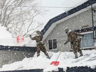 青森県の災害派遣要請を受け、屋根の雪下ろしをする自衛隊員=2日午後、青森市(陸上自衛隊第9師団提供)