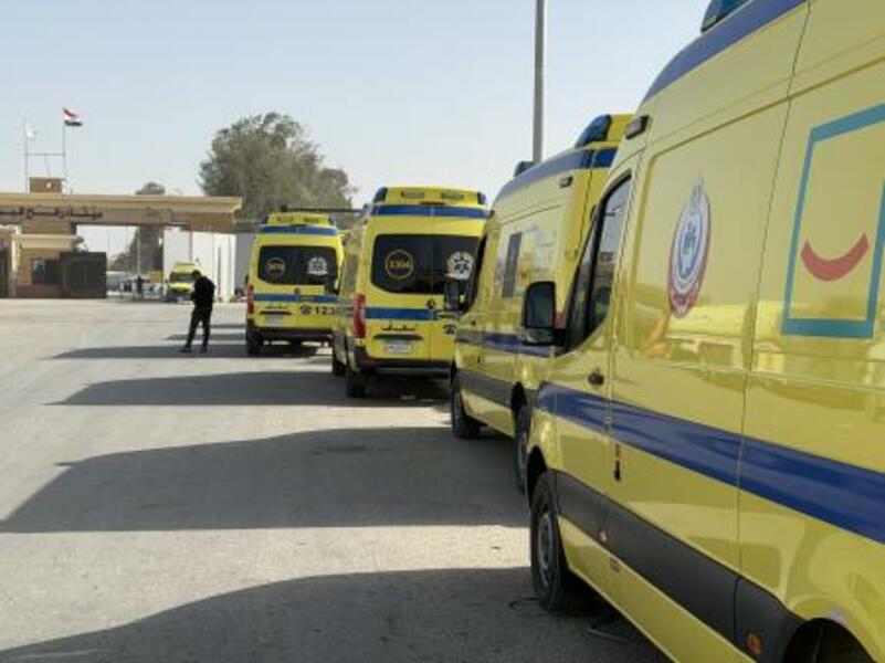 ラファ検問所のエジプト側で、待機する救急車=2日(ゲッティ=共同)