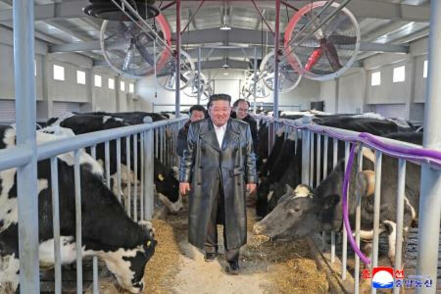 北朝鮮北西部の平安北道雲田で操業を始めた畜産施設を視察する金正恩朝鮮労働党総書記=2日(朝鮮中央通信=共同)