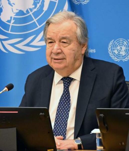 4日、国連本部で、AIに関する専門家パネルの候補者選定を発表する国連のグテレス事務総長=米ニューヨーク(共同)