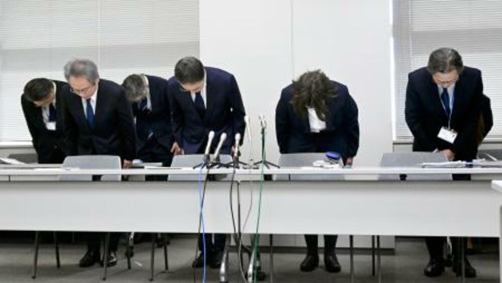 記者会見で謝罪する千葉県がんセンターの加藤厚病院長(右から3人目)ら=6日午後、千葉市