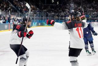 日本―フランス 第2ピリオド、先制ゴールを決め喜ぶ浮田(左)=ミラノ(共同)