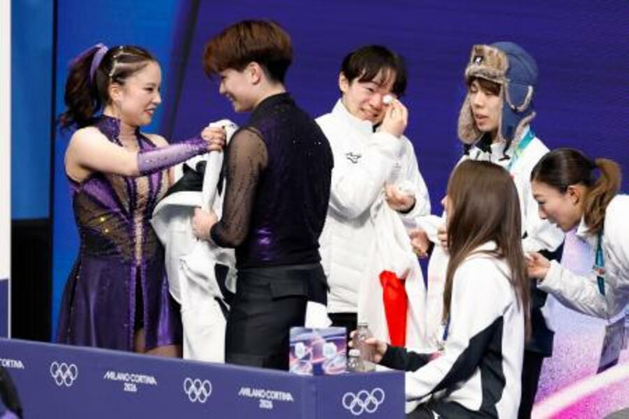団体アイスダンス・RDの演技を終えた吉田唄菜(左端)、森田真沙也組を前に涙ぐむ鍵山優真(左から3人目)=ミラノ(共同)