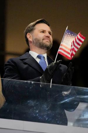 開会式で入場行進する米国選手団に拍手を送るバンス米副大統領=6日、イタリア・ミラノ(共同)