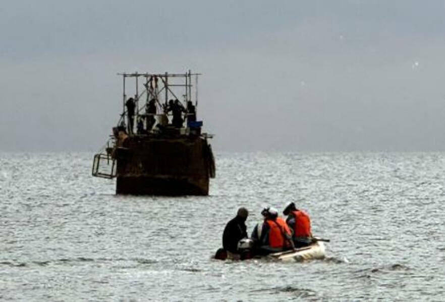 「長生炭鉱」の潜水調査中に体調不良となったダイバーの救出に向かう消防隊員ら=7日午後0時28分、山口県宇部市