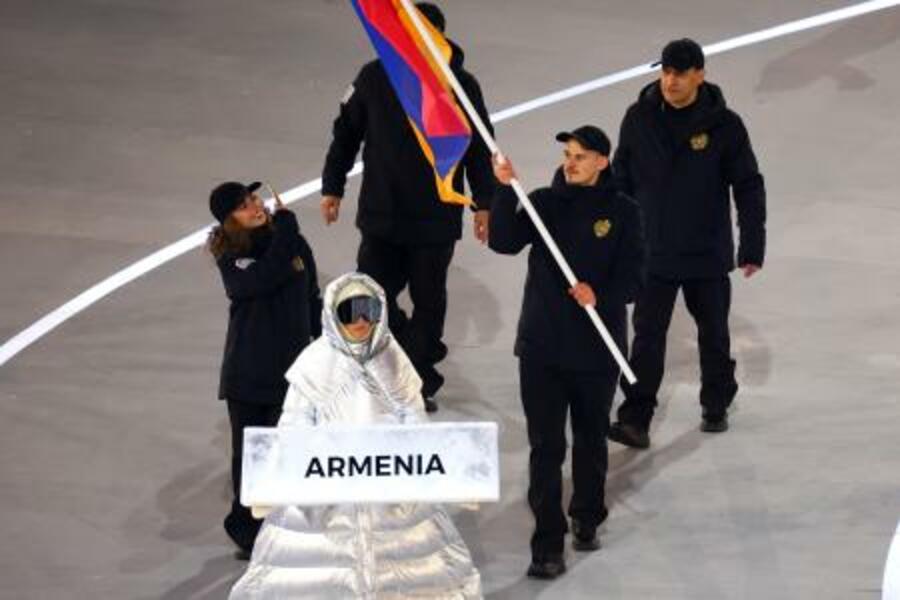 6日の開会式でアルメニアの旗手を務めるカリナ・アコポワとニキータ・ラフマニン=ミラノ(ゲッティ=共同)