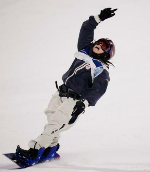 女子ビッグエア決勝 3回目のジャンプで着地を決め、喜ぶ村瀬心椛=リビーニョ(共同)
