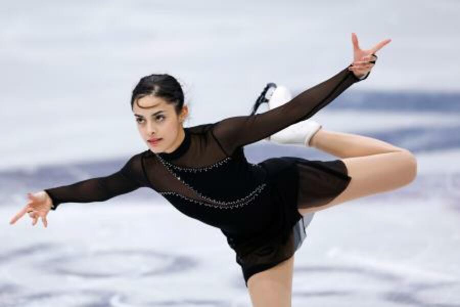 フィギュアスケートの公式練習で調整するカナダのマデリン・シザス=ミラノ(共同)