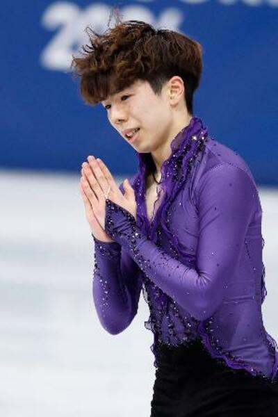 男子SPの演技を終え、手を合わせる佐藤駿=ミラノ(共同)