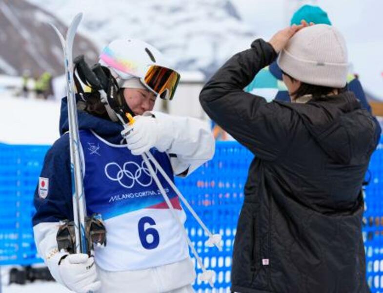 上村愛子さん(右)にねぎらわれ、涙ぐむ女子モーグルの冨高日向子=リビーニョ(共同)