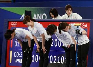 延長の末にデンマークに敗れ、引き揚げる(左から)近江谷、小谷、吉村、小野寺=コルティナダンペッツォ(共同)