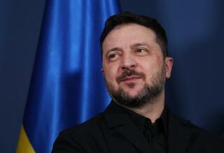 13日、ドイツ・ミュンヘンでメルツ首相との会談に臨むウクライナのゼレンスキー大統領(ゲッティ=共同)