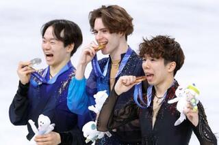 男子の表彰式で撮影に応じる(左から)銀メダルの鍵山優真、金メダルのミハイル・シャイドロフ、銅メダルの佐藤駿=ミラノ(共同)