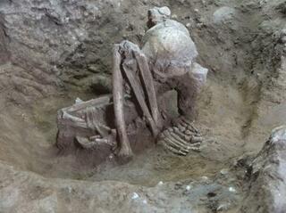 中国南部の遺跡で発見された、燻製されミイラになった9千年以上前の中年男性の人骨(国際研究チーム提供)