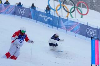 女子デュアルモーグル2回戦 第2エアを決める藤木日菜(右)=リビーニョ(共同)