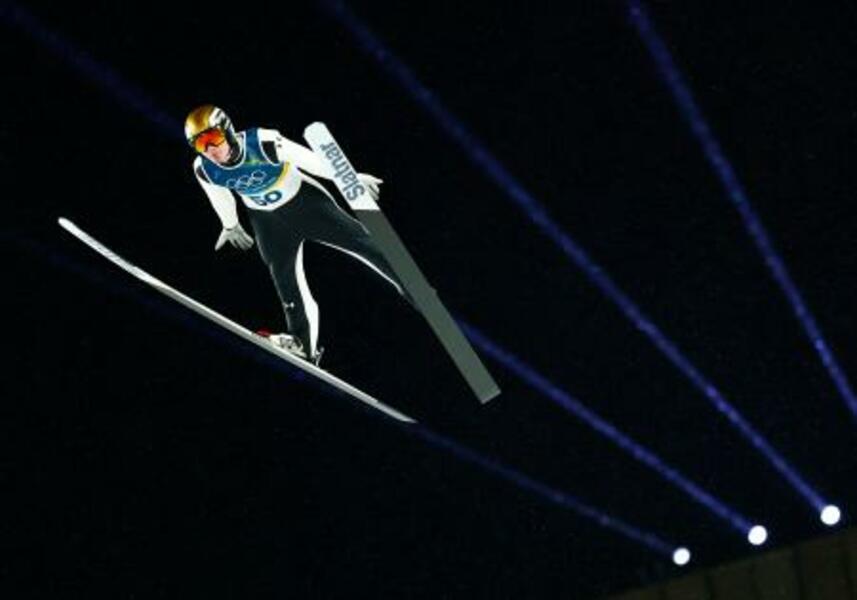 男子個人ラージヒルで金メダルを獲得したドメン・プレブツの1回目の飛躍=プレダッツォ(共同)