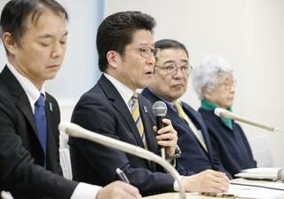 記者会見する拉致被害者家族会代表の横田拓也さん(左から2人目)ら=15日午後、東京都港区
