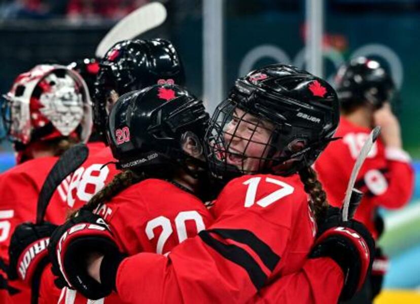 アイスホッケー女子準決勝でスイスに競り勝って喜ぶカナダの選手ら=16日(ロイター=共同)