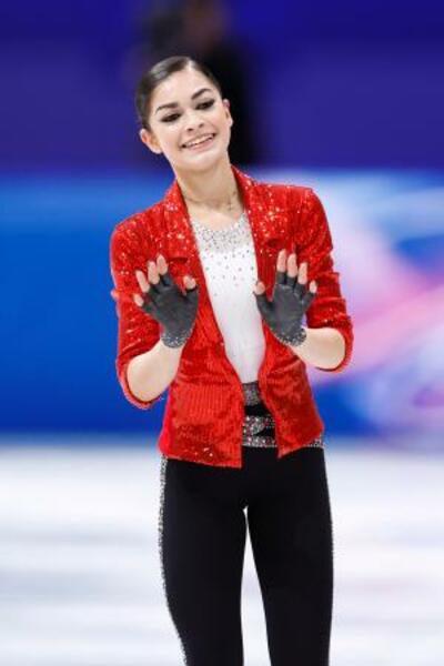 女子SPの演技を終え、手を振るアデリア・ペトロシャン=ミラノ(共同)