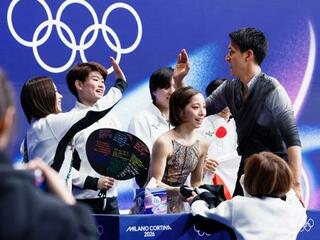 フィギュアスケート団体ペア・フリーの演技を終え、(左から)吉田唄菜、森田真沙也に迎えられる三浦璃来、木原龍一組=8日、イタリア・ミラノ(共同)