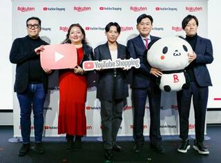 記者会見で撮影に応じる楽天グループの三木谷浩史会長兼社長(右から2人目)、米グーグル日本法人の奥山真司代表(左端)ら=19日午前、東京都内