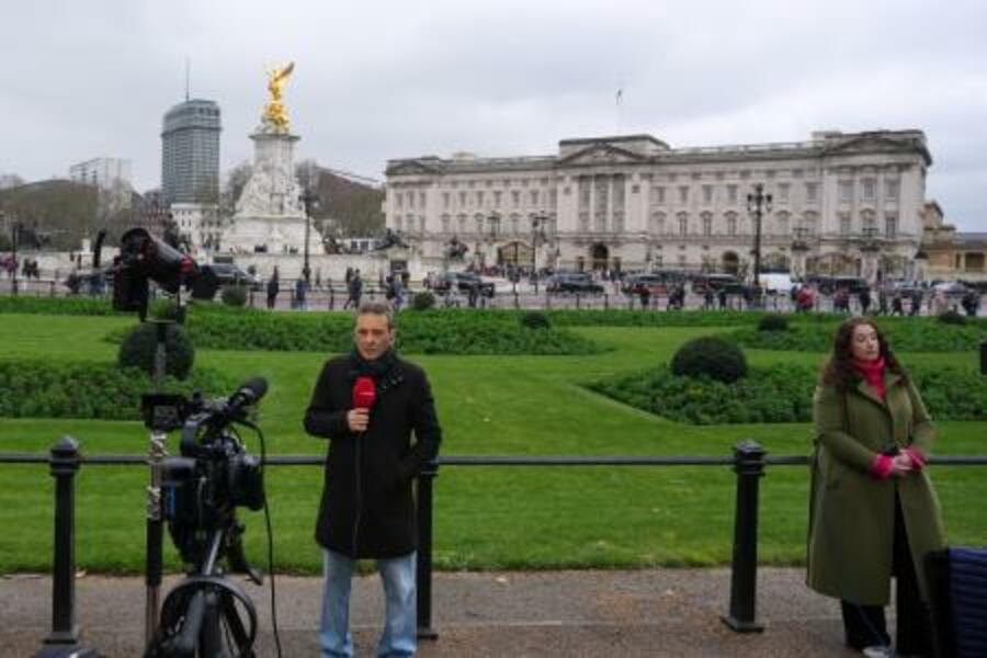 19日、アンドルー元王子が逮捕されたことを受けロンドンのバッキンガム宮殿前に集まった報道陣(AP=共同)