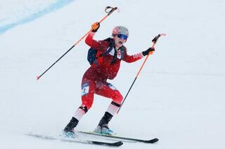 女子スプリント決勝でゴールし、喜ぶマリアンヌ・ファトン=ボルミオ(共同)