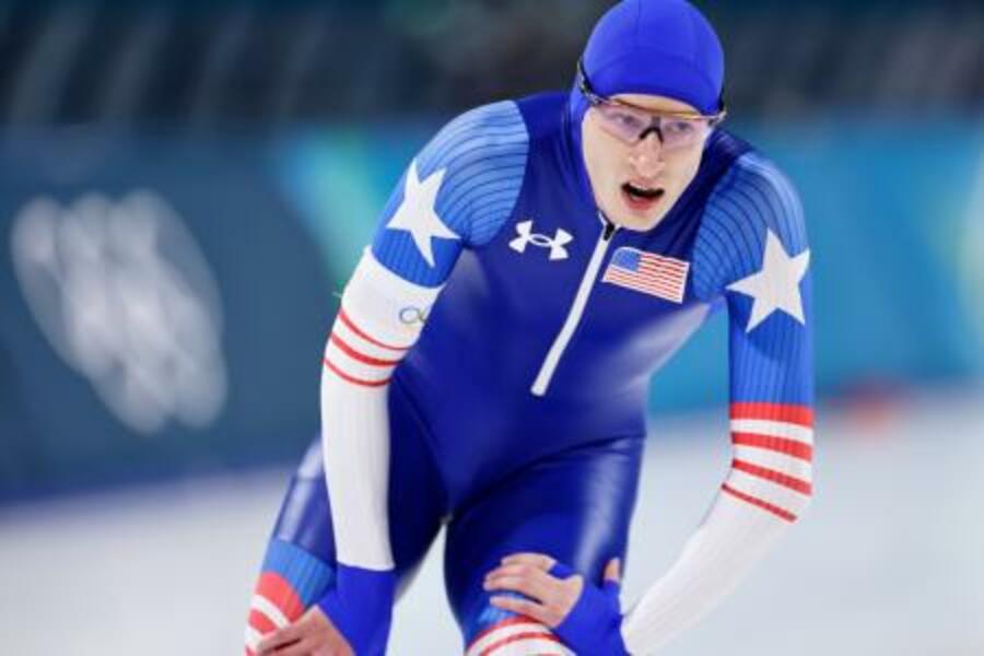 男子1500メートル レースを終えたジョーダン・ストルツ。銀メダルを獲得した=ミラノ(共同)