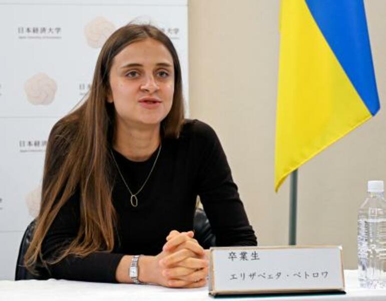 近況を報告するエリザベータ・ペトロバさん=20日午前、福岡県太宰府市の日本経済大