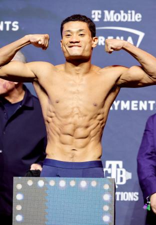 WBAスーパーライト級タイトルマッチの前日計量をクリアした平岡アンディ=20日、ラスベガス(ゲッティ=共同)