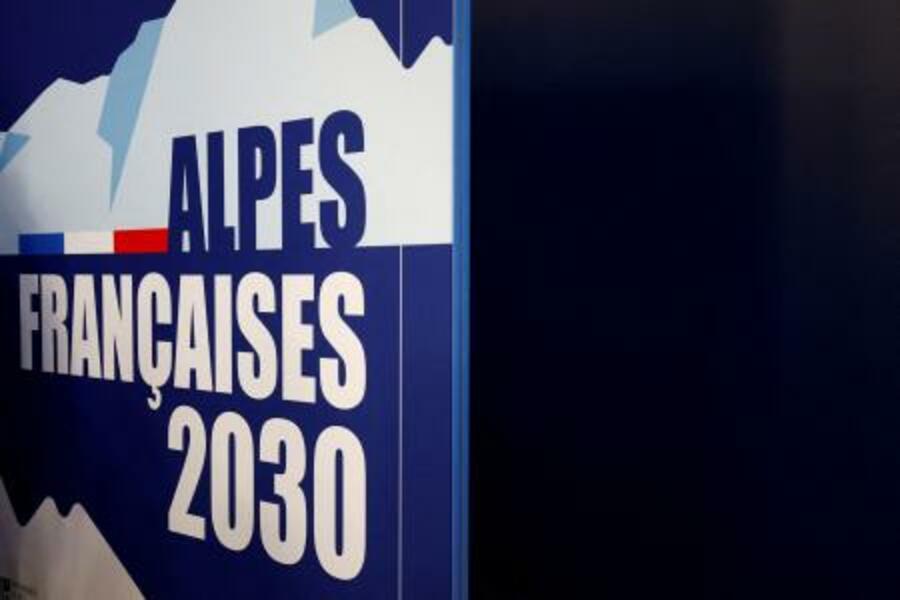 次回2030年にフランスのアルプス地域で行われる大会のロゴ=2025年2月、リヨン(ロイター=共同)