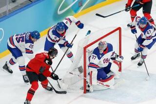 カナダ―米国 第3ピリオド、ゴールを守る米国のGKヘレバイック(右から2人目)=ミラノ(共同)