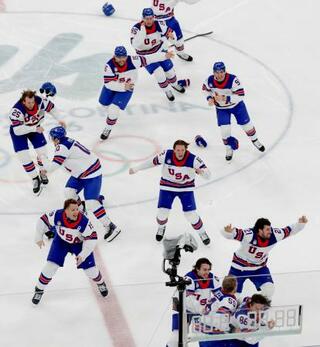 延長の末、カナダに勝利して金メダルを獲得し、歓喜する米国選手たち=ミラノ(共同)