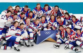 延長の末、カナダに勝利して金メダルを獲得し、写真に納まる米国の選手たち=ミラノ(共同)