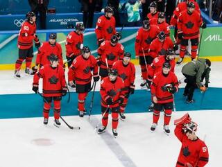 延長の末、米国に敗れて肩を落とすカナダの選手たち=ミラノ(共同)