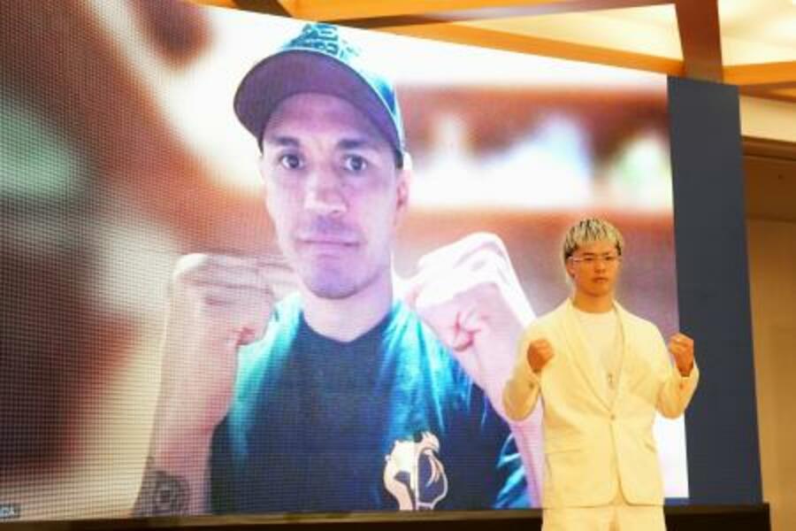 リモートで記者会見に参加したフアンフランシスコ・エストラダとポーズをとるWBCバンタム級2位の那須川天心=25日、東京都文京区