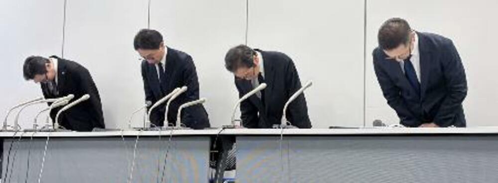 エレベーターの事故について謝罪する、東武タワースカイツリーの幹部ら=25日午後、東京都墨田区