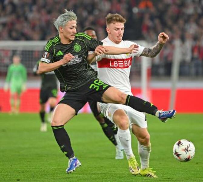 シュツットガルト戦で競り合うセルティックの前田(左)=シュツットガルト(共同)